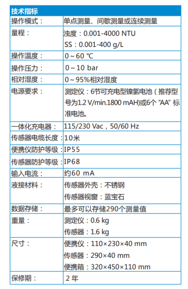 TSS Portable便携式浊度、悬浮物和污泥界面监测仪在市政和工业废水、饮用水以及河流监测中是一种非常理想的远程监测工具。该仪器可以用做监测过程中的一种优化工具,也可以作为校准或验证在线传感器的一种简便方法。①特性和优点• 一台仪器可以测量三个参数• 多条校准曲线,便于使用• 简便的污泥界面测量• 气泡补偿测量保证更高的精度• 测量材质,使用寿命长• 使用可充电的电池供电②技术指标③订购信息